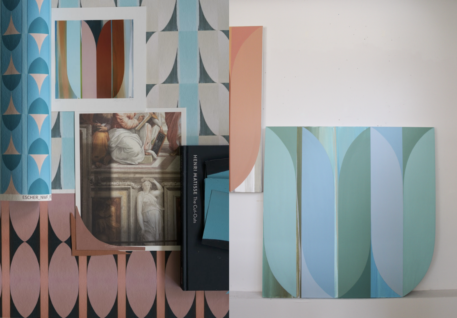 Works on paper lead into to large-scale paintings, which are then translated into fabric and wallpaper patterns by digitally repeating isolated sections. Materials from her painting process, along with cut fabric scraps, are later reassembled into collage work, feeding back into the beginning of the cycle.